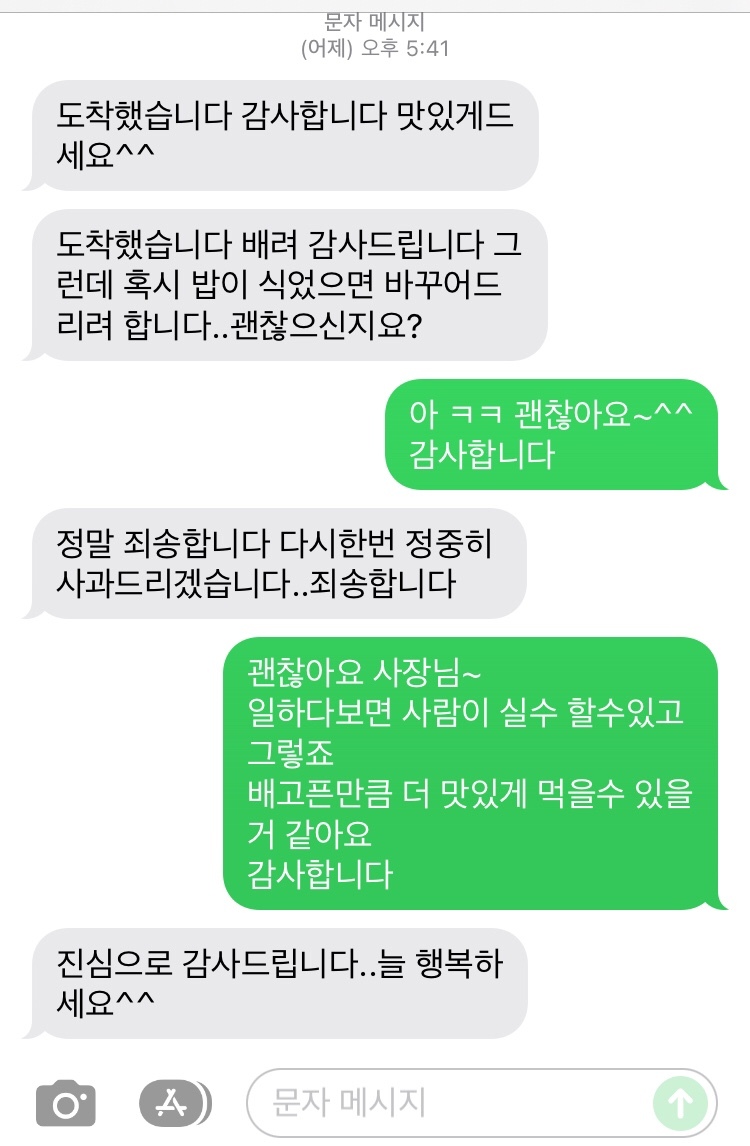잠시후 해장국이 다시 배달되었는데, 혹시 밥이 식었으면 다시 배달을 해드리냐는 문자가 왔다