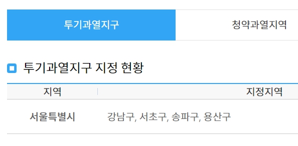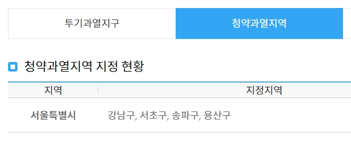 투기과열지구로 지정된 지역은, 서울특별시 강남구, 서초구, 송파구, 용산구가 있고, 청약과열지역으로 지정된 지역 역시 서울특별시 강남구, 서초구, 송파구, 용산구로 동일하게 적용되어 있습니다.